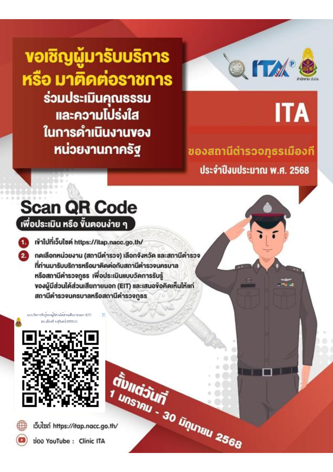 สถานีตำรวจภูธรเมืองที ได้ดำเนินการประชุมการขับเคลื่อนการประเมินคุณธรรมและ ความโปร่งใสในการดำเนินงานของหน่วยงานภาครัฐ (Integrity and Transparency Assessment: ITA) ของสถานีตำรวจ ประจำปีงบประมาณ พ.ศ. 2568 โดยมี พันตำรวจเอก นรวิชญ์ จุลวานิช ผู้กำกับการสถานีตำรวจภูธรเมืองที เป็นประธานการประชุม ซึ่งการประชุมดังกล่าวมีวัตถุประสงค์เพื่อแจ้งคำสั่งแต่งตั้งคณะกรรมการขับเคลื่อนการประเมินคุณธรรมและความโปร่งใสในการดำเนินงานของหน่วยงานภาครัฐ (Integrity and Transparency Assessment: ITA) ของสถานีตำรวจ และทำความเข้าใจ กรอบการประเมินคุณธรรมและความโปร่งใสในการดำเนินงานของหน่วยงานภาครัฐ (Integrity and Transparency Assessment: ITA) ของสถานีตำรวจ ประจำปีงบประมาณ พ.ศ. 2568 ประกอบด้วย 3 ประเด็นสำคัญ ได้แก่